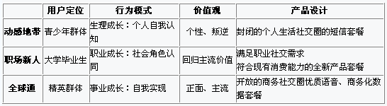 他們不約而同的將13歲—18歲與18歲—25歲的人群劃分為兩個(gè)不同的市場(chǎng),這也正是考慮到這兩個(gè)完全不同人生階段的群體的價(jià)值差異化。因此,我建議在中國(guó)移動(dòng)在動(dòng)感地帶品牌表現(xiàn)的“青春叛逆”與全球通品牌訴求的“事業(yè)成功”之間,將20歲—25歲人群定義為“職場(chǎng)新人”,進(jìn)行針對(duì)性的產(chǎn)品設(shè)計(jì),并以之創(chuàng)立一個(gè)以“職業(yè)成長(zhǎng)”為品牌訴求的客戶品牌,以之更好的滿足了青年人步入社會(huì)的精神需要與情感體驗(yàn)。