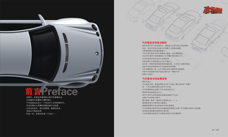 封二借鑒了國外的一本畫冊內(nèi)頁,府視的車體為本人電腦從繪,給人一種高貴不凡的氣質(zhì)感受,使人相信企業(yè)的高品質(zhì)。