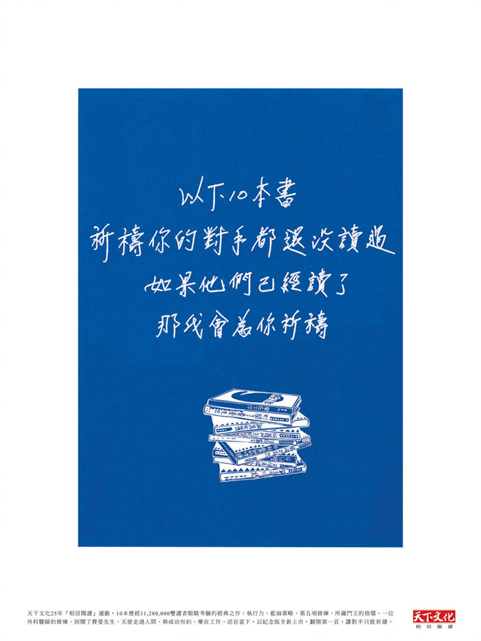 當(dāng)前位置:中國廣告人網(wǎng)站>創(chuàng)意策劃>平面饕餮>詳細(xì)內(nèi)容 天下文化出版社平面廣告(4) 作者:佚名 時(shí)間:2009-10-19 字體:[大] [中] [小]