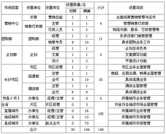 ◇長沙市區(qū)流通、酒店、團購等部門市場開發(fā)初期也不滿編,待市場開發(fā)有一定基礎(chǔ)后根據(jù)市場實際需要增編。