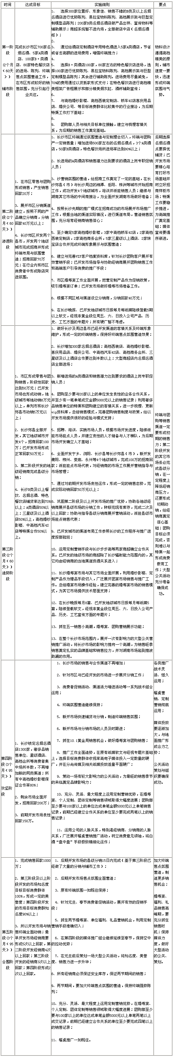 建立好根據(jù)地才能談上進軍全國市場,本文中市場操作部分主要圍繞樹立基地市場展開。因時間等因素,很多方面沒有完全、細致地展開描述。有再好的策略與戰(zhàn)略、戰(zhàn)術(shù)等營銷方向與技戰(zhàn)術(shù),還需要一個思路清晰,有很強執(zhí)行力的團隊來執(zhí)行;在實施過程中有很多的內(nèi)容需要細致地進行制度化、條款化、明細化,明確的規(guī)章制度、政策條款是管理的保證;此外,市場的監(jiān)控,人員的管理,分階段目標管理等等,都是市場能否取得成功的關(guān)鍵,在此不做贅述。
