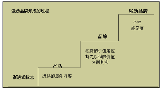 眾所周知,強勁品牌形成的過程有三層,即產品-品牌-強勁品牌,其漸進式的標志分別為提供的服務內容-獨特的價值定位,持之以恒的價值名副其實-品牌個性與能見度。如圖所示: