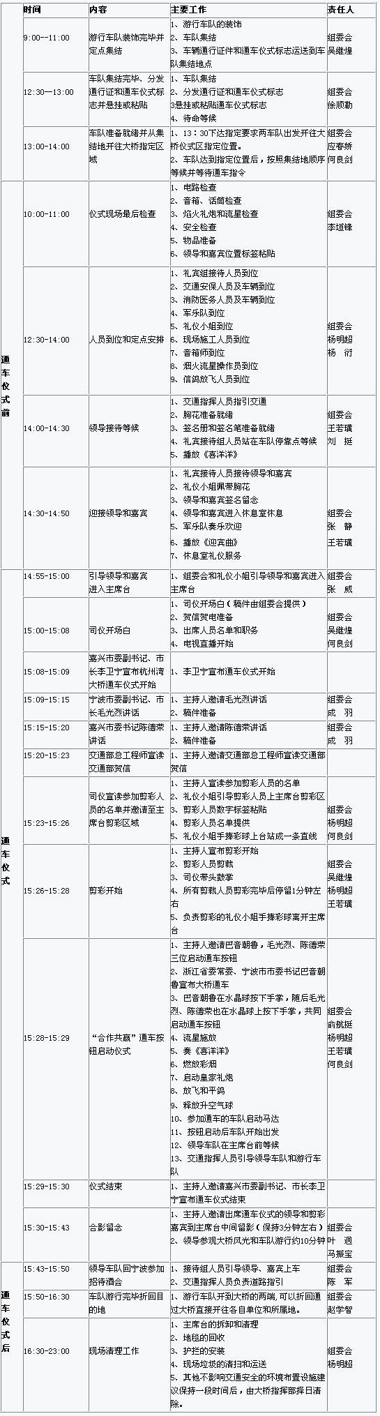 16:30—23:00 等所有非工作車輛通過儀式區(qū)后,現(xiàn)場清理工作開始,但同時保留少部分不影響交通安全的相關(guān)現(xiàn)場布置物品,擇日由大橋指揮部清除。