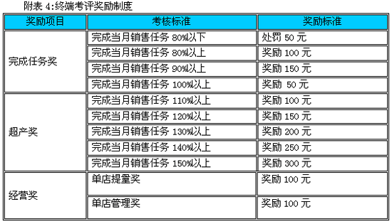 在促銷期內(nèi),為了充分激活可采系統(tǒng)內(nèi)的促銷團(tuán)隊(duì)的能量,首先讓全體可采促銷導(dǎo)購人員悉數(shù)參加了活動(dòng)前的促銷活動(dòng)動(dòng)員大會和業(yè)務(wù)分工部署會議,以進(jìn)一步了解整個(gè)活動(dòng)的宗旨和推盤沙演的整個(gè)過程;除此之外,還有針對性地要求由各區(qū)域市場的城市經(jīng)理、促銷主管分別組織轄區(qū)促銷導(dǎo)購人員再進(jìn)行一次全面的產(chǎn)品知識和促銷技巧技能的培訓(xùn)活動(dòng)。最后,為了確保本次促銷活動(dòng)計(jì)劃的落地質(zhì)量,進(jìn)一步激發(fā)促銷隊(duì)伍的主觀能動(dòng)性,在促銷期內(nèi),還特別推出了針對促銷隊(duì)伍的終端考評獎(jiǎng)勵(lì)制度,詳見下表: