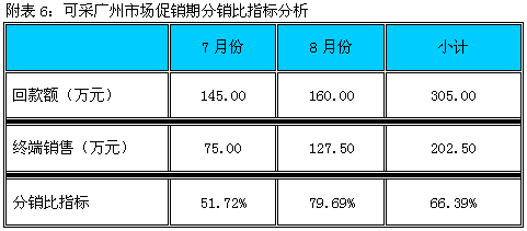 備注:通過上表我們不難看出,在促銷期內(nèi),由于促銷資源的傾斜和促銷力度的加強(qiáng),有效改善了促銷發(fā)生期前,分銷比指標(biāo)嚴(yán)重失衡的狀況,且遠(yuǎn)遠(yuǎn)高于43%的臨界比率水平。