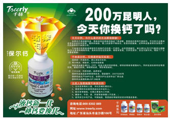 ‘同樣是液體鈣,效果的差距咋就這么大呢?’‘新一代液鈣,引發(fā)的補鈣奇跡’、‘200萬KM人,今天你換鈣了嗎?’‘千林保爾鈣--鉆石標準,春城掀起換鈣潮’系列平面廣告的推出同時有選擇的搭配電視和廣播廣告,電視選擇黃金時段電視劇掛標形式進行品牌滲透,電臺廣告以目標消費群交通頻道為主,形成了立體式媒體組合,整合傳播的策略,一個聲音、一個形象全力塑造保爾鈣‘鉆石標準’,劃開與其他液鈣品牌的差異——液鈣有兩種,一種是千林的,一種是其他的。