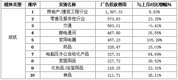 據(jù)央視索福瑞最新調(diào)查,2006年1月報(bào)紙媒體前十位行業(yè)類別的投放排名中,家居用品廣告投放費(fèi)用為227.72百萬元,排行榜第八名,而房地產(chǎn)/建筑工程行業(yè)廣告投放費(fèi)用高達(dá)為1,397.32萬元,穩(wěn)居排行榜第二名。(如下圖)(單位:百萬元)