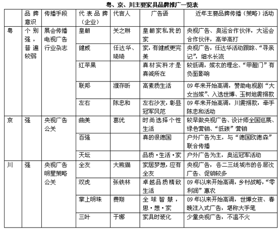 祖,其歷史都要追溯到十年之前。而浙江、四川家具的發(fā)展卻是近些年的事,用顧家工藝總裁顧江生先生的話說,1999年以前還不知道有家具展覽會(huì)。廣交會(huì)、現(xiàn)有的三大家具展包括深圳家具展、廣州家具展、東莞家具展,是廣東家具品牌每年?duì)I銷推廣最重要的契機(jī)。通過展會(huì)尋求經(jīng)銷商和接訂單,是廣東家具企業(yè)生存的主要手段。有人甚至夸張地形容,只要在這幾個(gè)展覽會(huì)上贏得漂亮,一年都不用擔(dān)心銷量問題,也不必再花心思做其他宣傳推廣。但是,正是這種過于依賴會(huì)展?fàn)I銷、忽視長期品牌建設(shè)和渠道建設(shè)的做法,開始讓廣東家具嘗到苦果,甜果子正一步步溜到了川派、京派家具口中。 起步初期為國外品牌OEM加工的經(jīng)歷,為廣東人隨后創(chuàng)建自有品牌積累了豐富的經(jīng)驗(yàn)。與此相適應(yīng),大多數(shù)廣東品牌奠定了中、高端路線的基調(diào),主攻一線市場,例如皇朝、紅蘋果、健威、聯(lián)邦等等。也因?yàn)槠涓吒咴谏系亩ㄎ,廣東家具在很長一段時(shí)間內(nèi)主要依靠渠道營銷,即通過經(jīng)銷商,讓產(chǎn)品直接到達(dá)高端目標(biāo)客戶,再加上擁有成熟的展會(huì)平臺(tái)、各大家具協(xié)會(huì)地位強(qiáng)勢,使展會(huì)經(jīng)濟(jì)成為廣東家具界的頭等大事。