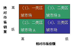 根據(jù)主觀分類法,我們以絕對市場銷量和相對市場份額為兩個緯度,可以將企業(yè)銷售的區(qū)域市場,分為以下幾類。