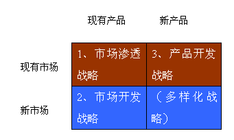 這兩個分類法對于企業(yè)而言,都有重要意義,但需要區(qū)分企業(yè)所要解決的問題是什么。根據(jù)“安索夫的產(chǎn)品——市場擴展方格圖”,企業(yè)有三種密集型成長戰(zhàn)略。