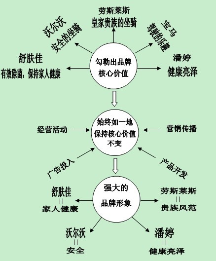 核心價值是品牌的終極追求,是一個品牌營銷傳播活動的原點(diǎn),即企業(yè)的一切價值活動(直接展現(xiàn)在消費(fèi)者面前的是營銷傳播活動)都要圍繞品牌核心價值而展開,是對品牌核心價值的體現(xiàn)與演繹,并豐滿和強(qiáng)化品牌核心價值。品牌管理的中心工作就是清晰地規(guī)劃勾勒出品牌的核心價值,并且在以后的十年、二十年,乃至上百年的品牌建設(shè)過程中,始終不渝地要堅(jiān)持這個核心價值。只有在漫長的歲月中以非凡的定力去做到這一點(diǎn),不會被風(fēng)吹草動所干擾,讓品牌的每一次營銷活動、每一分廣告費(fèi)都為品牌作加法,起到向消費(fèi)者傳達(dá)核心價值或提示消費(fèi)者聯(lián)想到核心價值的作用。久而久之,核心價值就會在消費(fèi)者大腦中烙下深深的烙印,并成為品牌對消費(fèi)者最有感染力的內(nèi)涵。