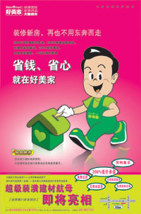 從2月14日開(kāi)始,好美家江東店開(kāi)業(yè)活動(dòng)廣告投放啟動(dòng)。依據(jù)開(kāi)業(yè)方案制定的好美家江東店定位,我們將“省錢(qián)、就在好美家”發(fā)揚(yáng)光大。在報(bào)紙廣告?zhèn)鞑ド弦钥ㄍㄐ蜗筘灤┦冀K,我們將好美家過(guò)去的“家裝能手”卡通形象加以修改,以更年輕、活力、親切的形象出現(xiàn)。以嫩綠色為畫(huà)面主色調(diào),連續(xù)推出《情人節(jié)形象篇》、《省錢(qián)篇》及《“好”、“美”、“家”三則篇》,特別是將卡通人物往儲(chǔ)蓄屋投金幣作為開(kāi)業(yè)系列廣告的第二Logo,與電視FLASH視覺(jué)相統(tǒng)一,頻繁出現(xiàn),加強(qiáng)訴求點(diǎn)的視覺(jué)記憶,突出強(qiáng)化“省錢(qián)”概念。