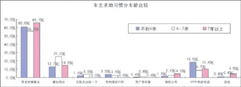 5.緊急情況下,車主求助習(xí)慣分車齡比較。SVW的求助電話使用率4年以下車主使用率最高,4~7年車主使用率最低,相應(yīng)地4~7年的車主去常去的維修點(diǎn)的比率也低,而就近的比率卻很高(見圖5)。