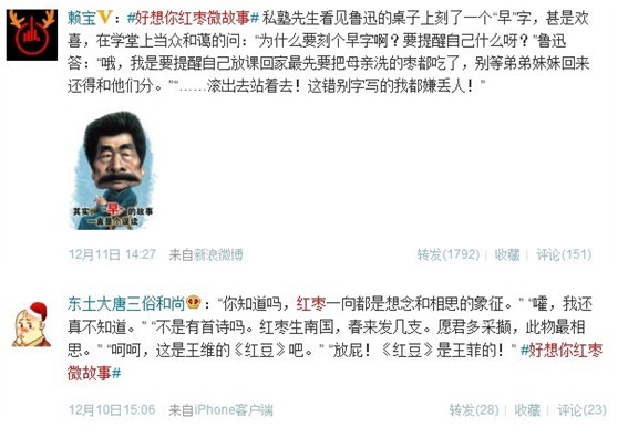 首先于12月3日通過好想你官微發(fā)起#好想你紅棗微故事#大賽活動,圍繞“好想你紅棗”創(chuàng)作情感微故事,并設一等獎(紅棗獎)1名,二等獎(洗澡獎)3名,三等獎(搓棗獎)10名,另有響應的獎品獎勵,提升參與者的積極性。然后通過@傳媒老王、@賴寶、@張錫磊、@全球熱門精選榜、@三峽在線、@木爾、@田桑、@東土大唐三俗和尚等大號或段子手轉發(fā)帶動人氣。