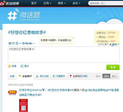 “好想你”是大眾詞匯,直接說好想你,難以聯(lián)想到紅棗,但“紅棗領導品牌”又太長,影響話題傳播,綜合考慮最終用#好想你紅棗微故事#作為話題,進行段子營銷。