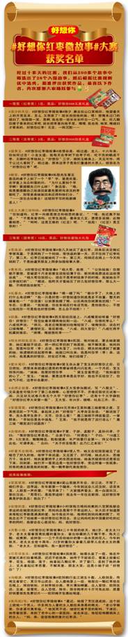 同時還進行了活動盤點,發(fā)布了《十大愛情故事》、《十大趣味故事》、《十大經(jīng)典故事》以及與好想你、紅棗或銷量領先結合最緊密的故事《十大最“好想你”故事》。最終@賴寶、@蒼南派、@東土大唐三俗和尚、@田桑等知名獲得相應獎項,而大部分獲獎作品都是網(wǎng)友原創(chuàng)作品,而非只選大V或段子手。