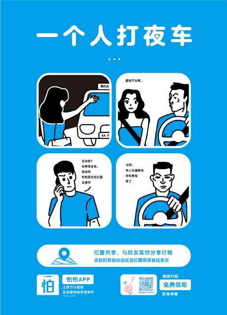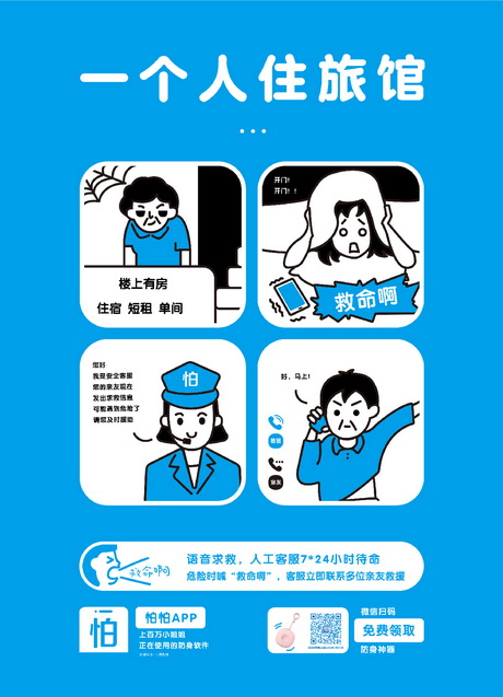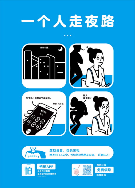 畫面勾勒了三個(gè)生活中常見(jiàn)場(chǎng)景小故事,分別是白領(lǐng)女孩下夜班回家路上被陌生男子尾隨,巧用怕怕APP的偽裝男友來(lái)電功能嚇退歹徒;時(shí)髦女孩獨(dú)自打夜車回家,被不良司機(jī)偷瞄還繞路,幸好有在怕怕APP上與男生分享實(shí)時(shí)位置,網(wǎng)約車司機(jī)知道自己的路線和車牌號(hào)已經(jīng)曝光遂放棄了圖謀不軌的念頭;女學(xué)生外出游玩獨(dú)自住經(jīng)濟(jì)旅館,半夜被敲門嚇得連喊”救命啊“,正是這聲”救命啊“觸了怕怕APP的語(yǔ)音報(bào)警功能,即使是凌晨怕怕客服仍舊第一時(shí)間通知女孩的多為親友及時(shí)展開救援。
